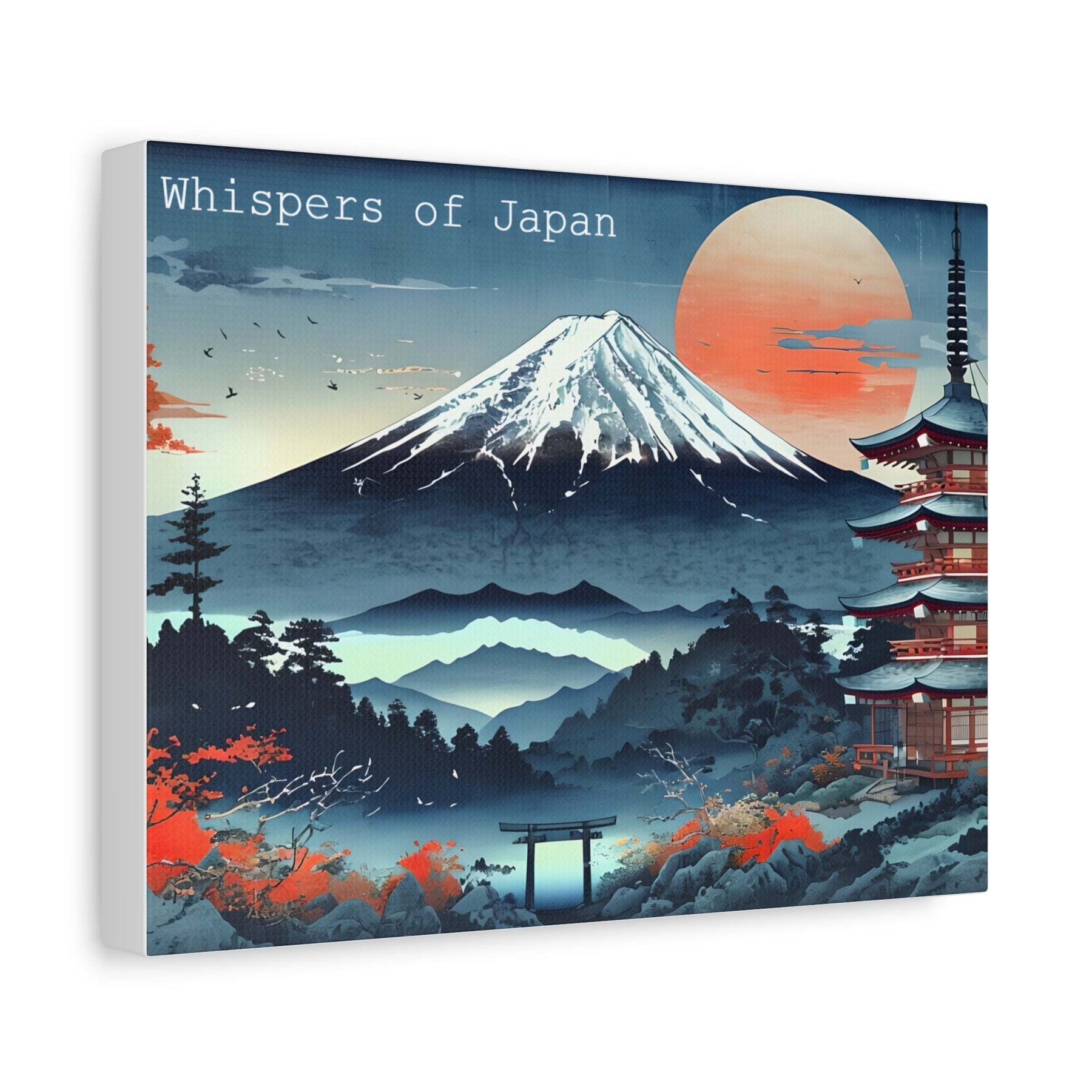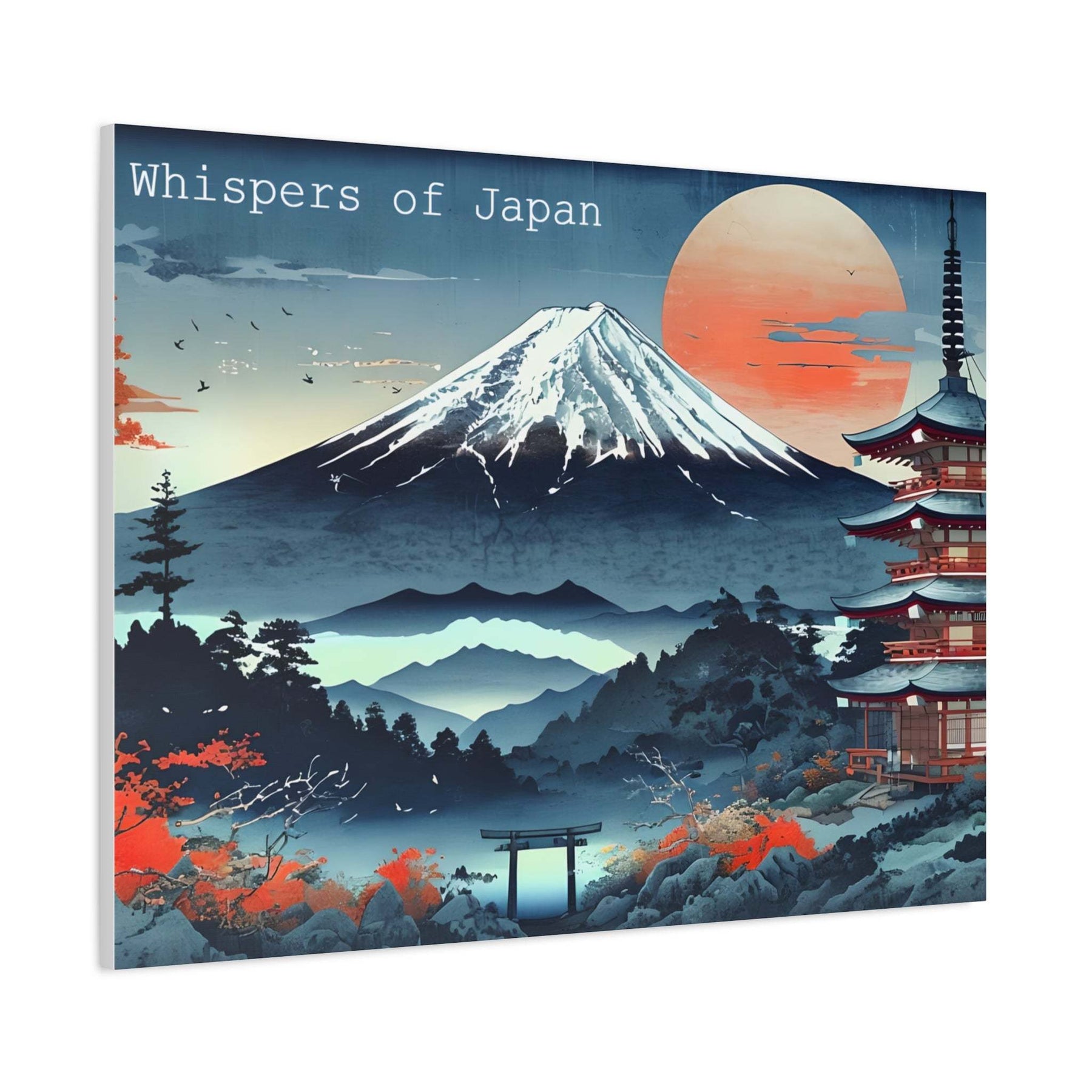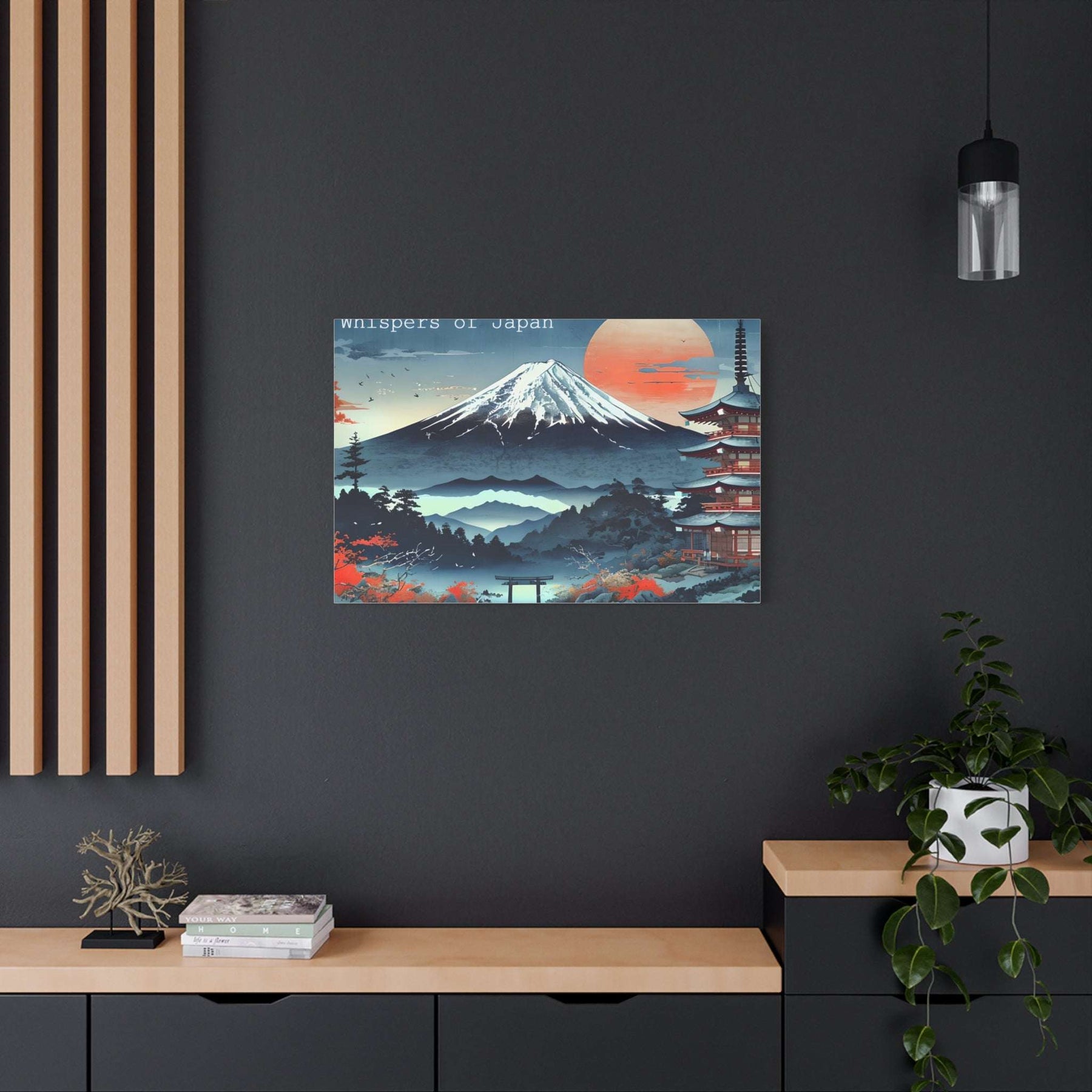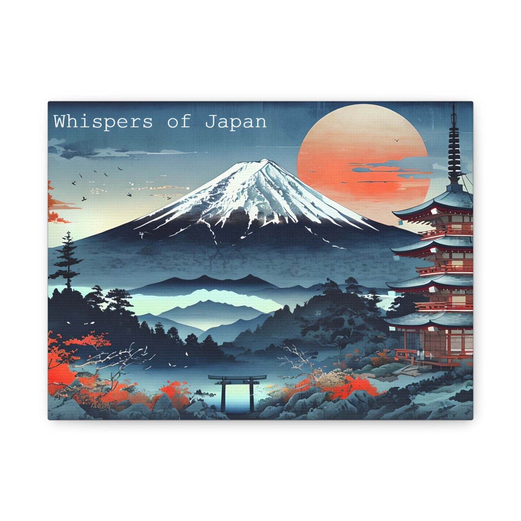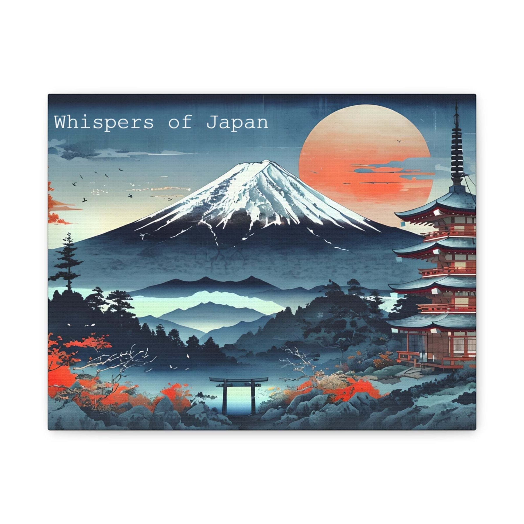 Whispers of Japan is a canvas art print featuring a photo of Mount Fuji on a setting sun with a picture of a pagoda. It exudes a serene and calming vibe, making it a perfect addition to a zen-inspired home or for those who appreciate Japanese culture & Japandi Art. Ideal for nature lovers, travel enthusiasts, and anyone looking to add a touch of tranquility to their space. Perfect for decorating during Japanese themed parties, celebrations, or cultural events. Great for gift-giving on occasions like birthdays, Father's Day, or housewarmings. Product features - Rubber dots on bottom for stability - Unique coating for highest quality images - Sustainable product made from renewable forests - Non-toxic latex inks used for printing - Five (5) different sizes Care instructions - If the canvas does gather any dust, you may wipe it off gently with a clean, damp cloth..