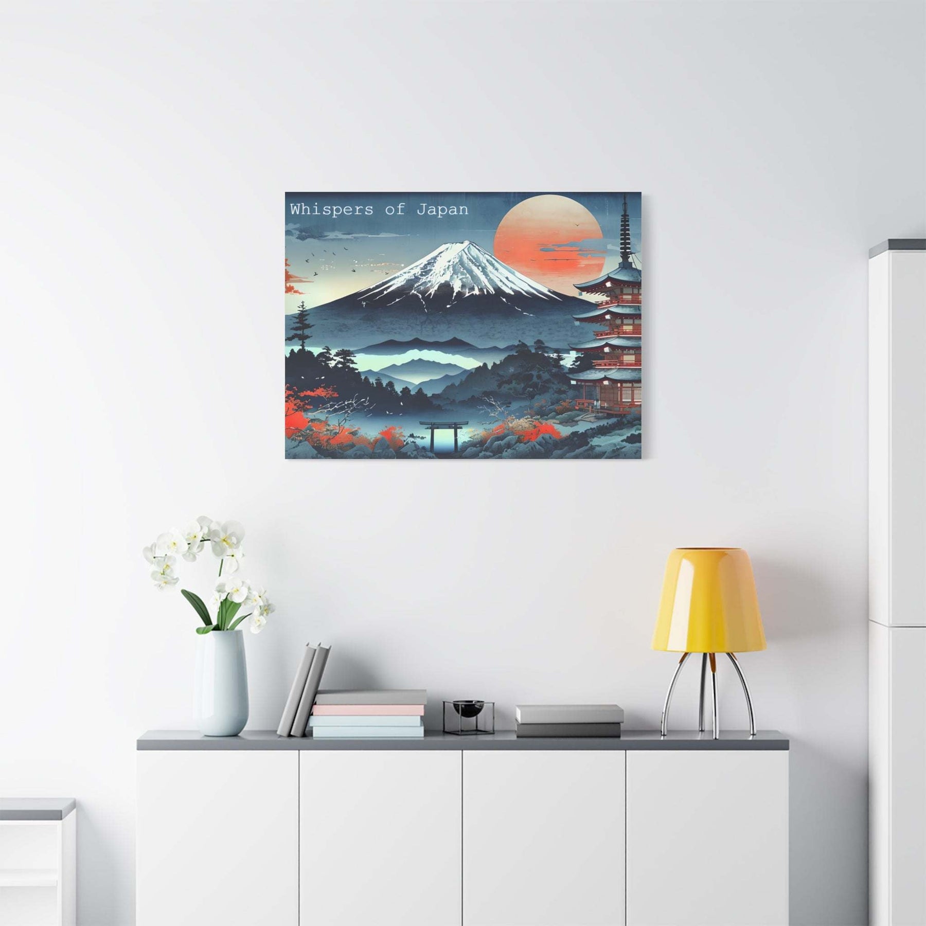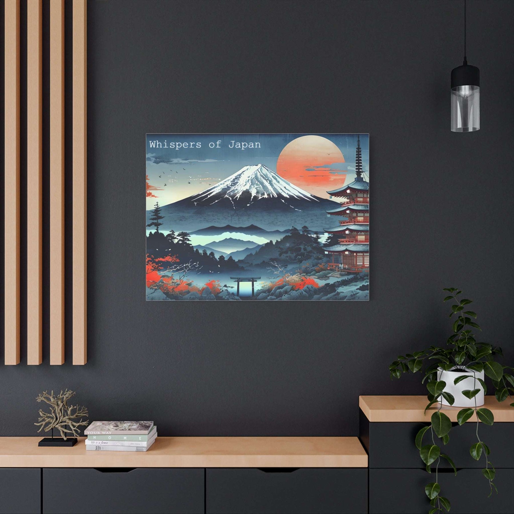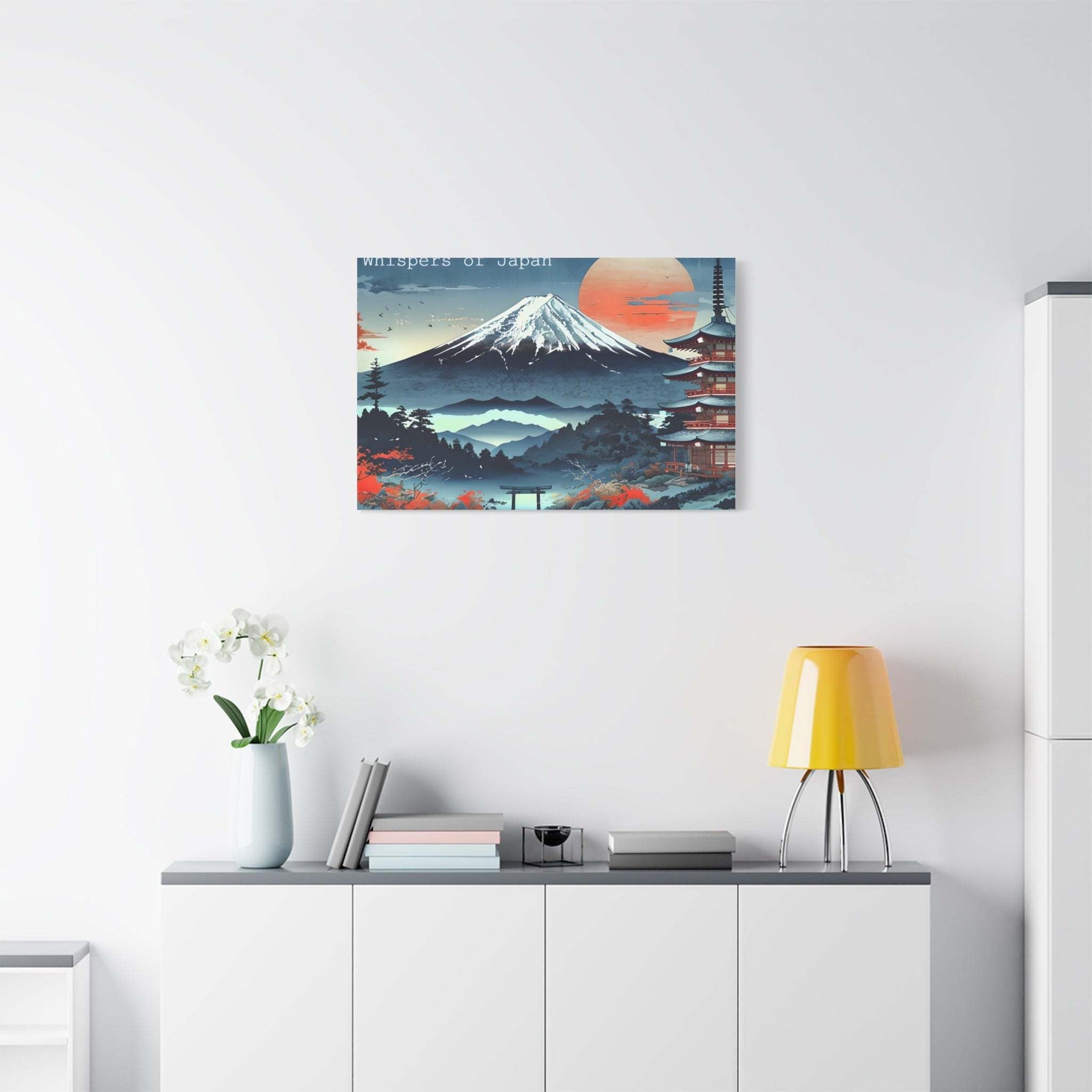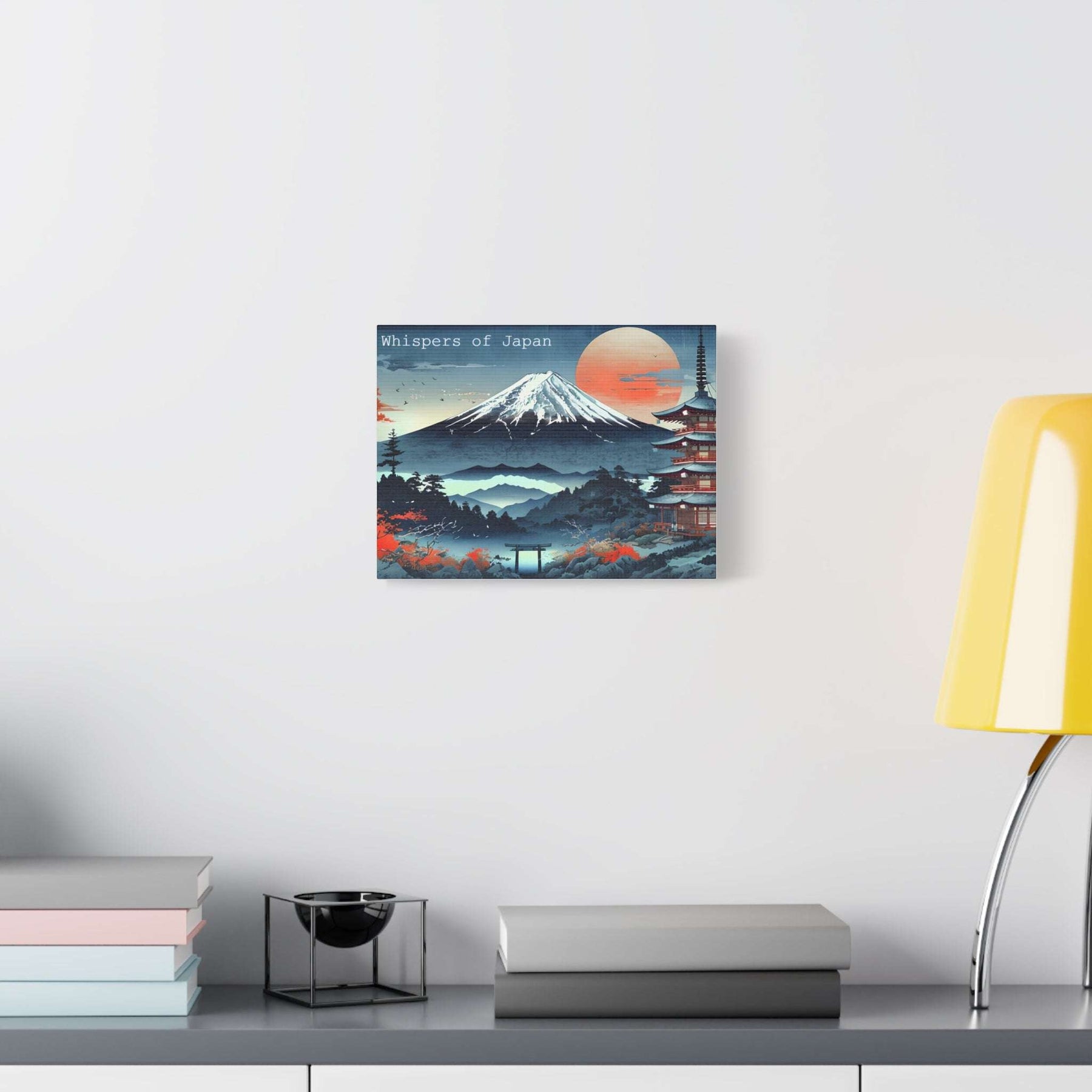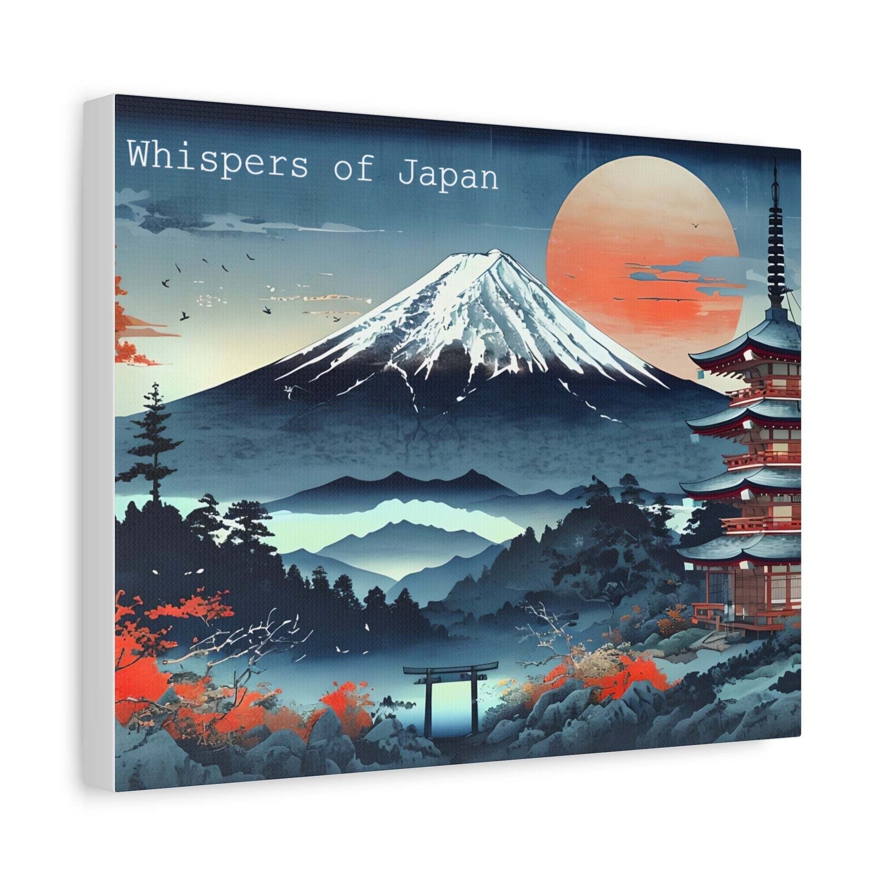 Whispers of Japan is a canvas art print featuring a photo of Mount Fuji on a setting sun with a picture of a pagoda. It exudes a serene and calming vibe, making it a perfect addition to a zen-inspired home or for those who appreciate Japanese culture & Japandi Art. Ideal for nature lovers, travel enthusiasts, and anyone looking to add a touch of tranquility to their space. Perfect for decorating during Japanese themed parties, celebrations, or cultural events. Great for gift-giving on occasions like birthdays, Father's Day, or housewarmings. Product features - Rubber dots on bottom for stability - Unique coating for highest quality images - Sustainable product made from renewable forests - Non-toxic latex inks used for printing - Five (5) different sizes Care instructions - If the canvas does gather any dust, you may wipe it off gently with a clean, damp cloth..